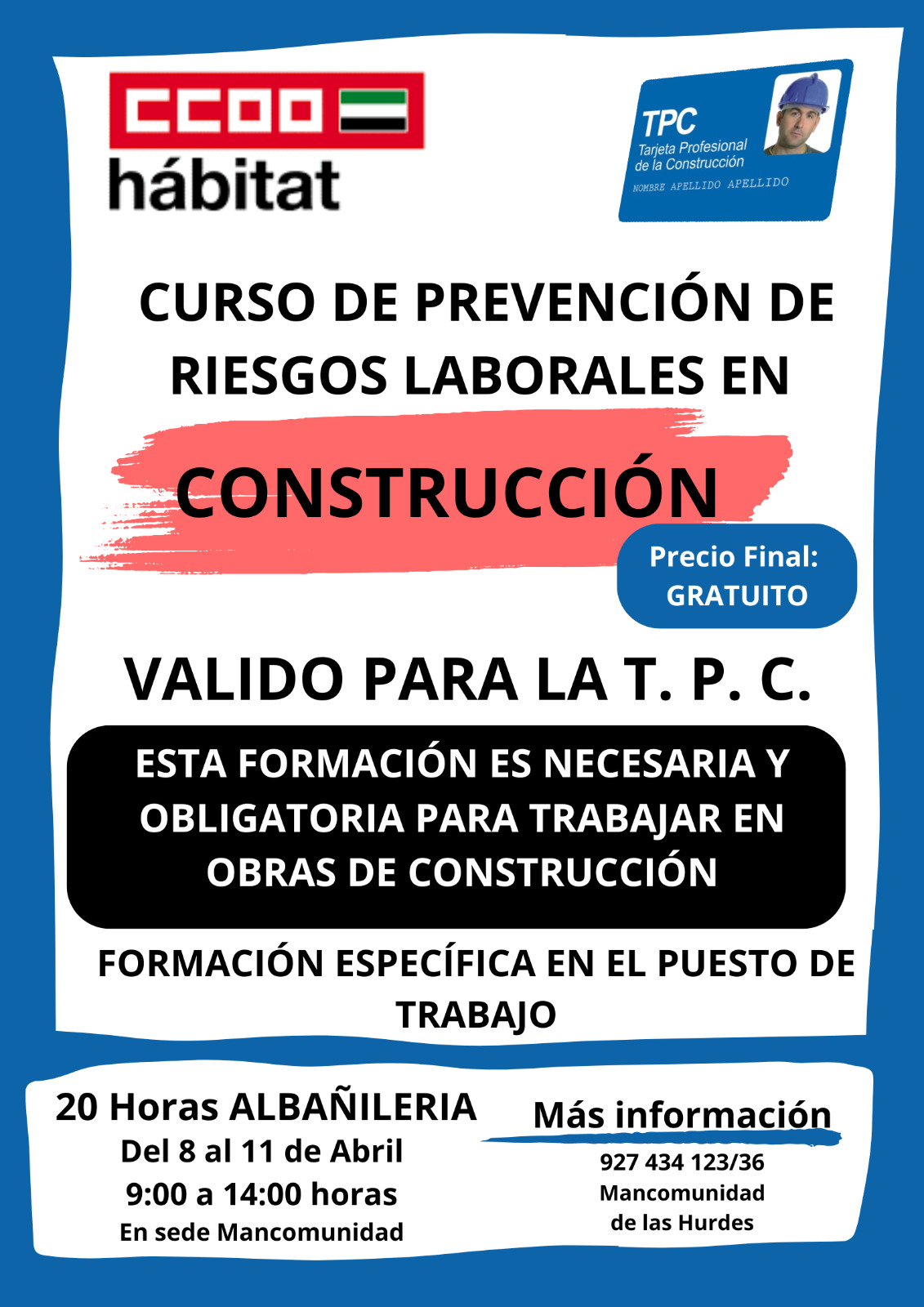 CURSO GRATUITO SOBRE PREVENCIÓN DE RIESGOS LABORALES EN LA CONSTRUCCIÓN EN LA SEDE DE LA MANCOMUNIDAD. ¡Anímate hacerlo! 18 febrero 2025 Del 8 al 11 de Abril HARAN EL CURSO LOS 12 PRIMEROS QUE SE APUNTEN.