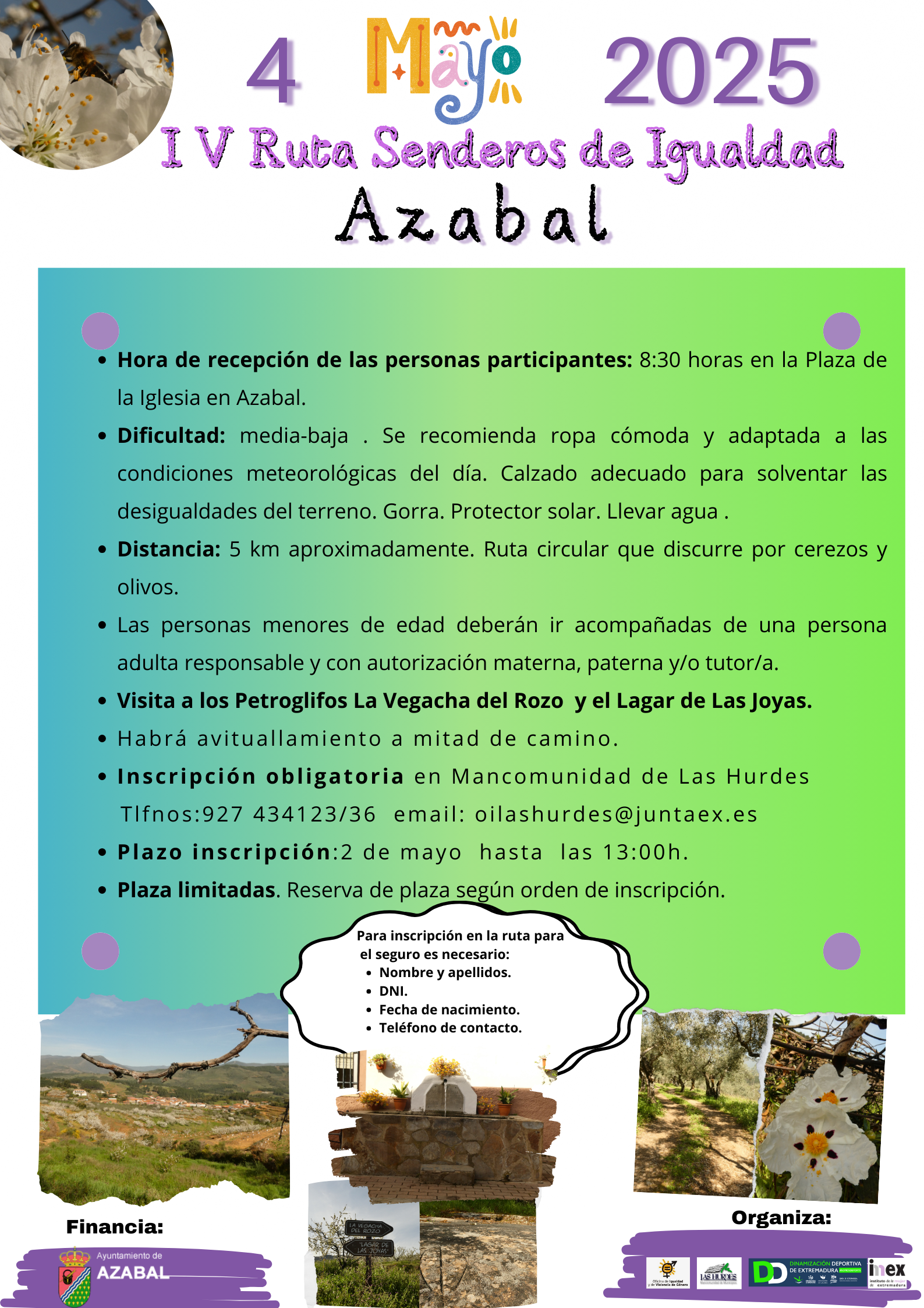 IV edición de la Ruta Senderos de Igualdad.Este año nos vemos el 4 de mayo en Azabal. Tendremos ocasión de caminar entre cerezos y olivos, así como visitar los Petroglifos de La Vegacha del Rozo y del Lagar de Las Joyas.